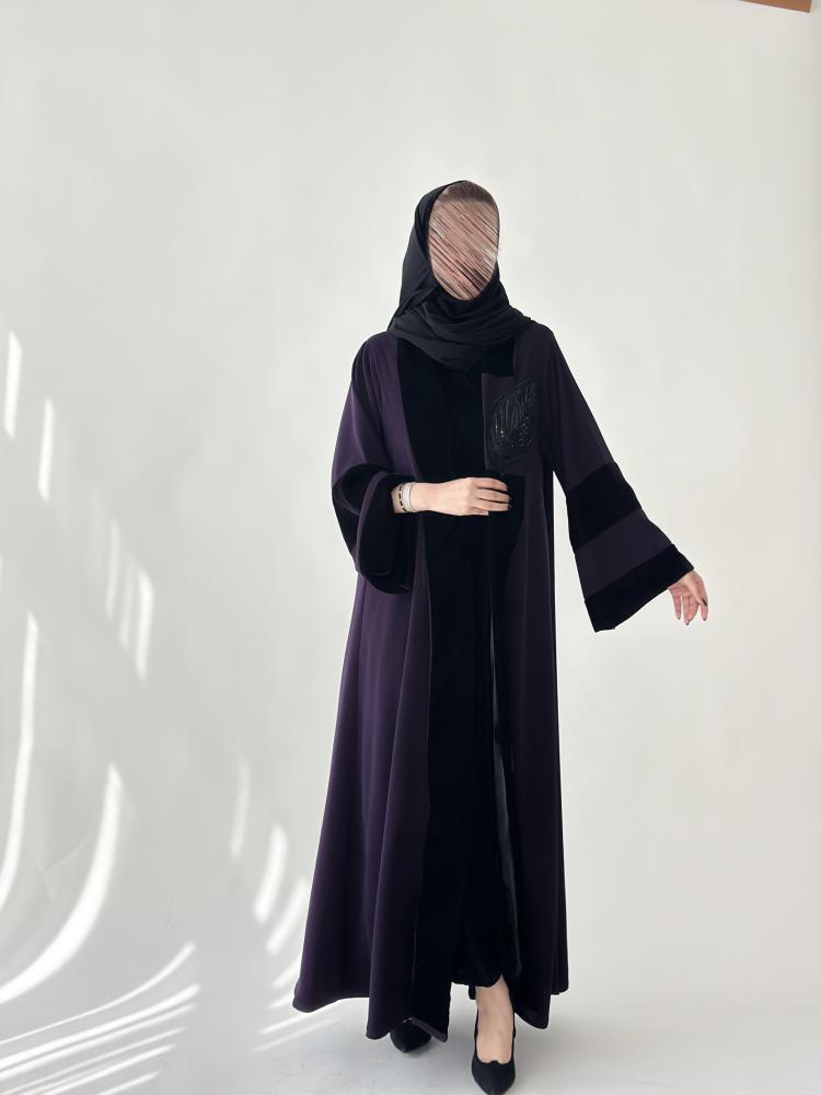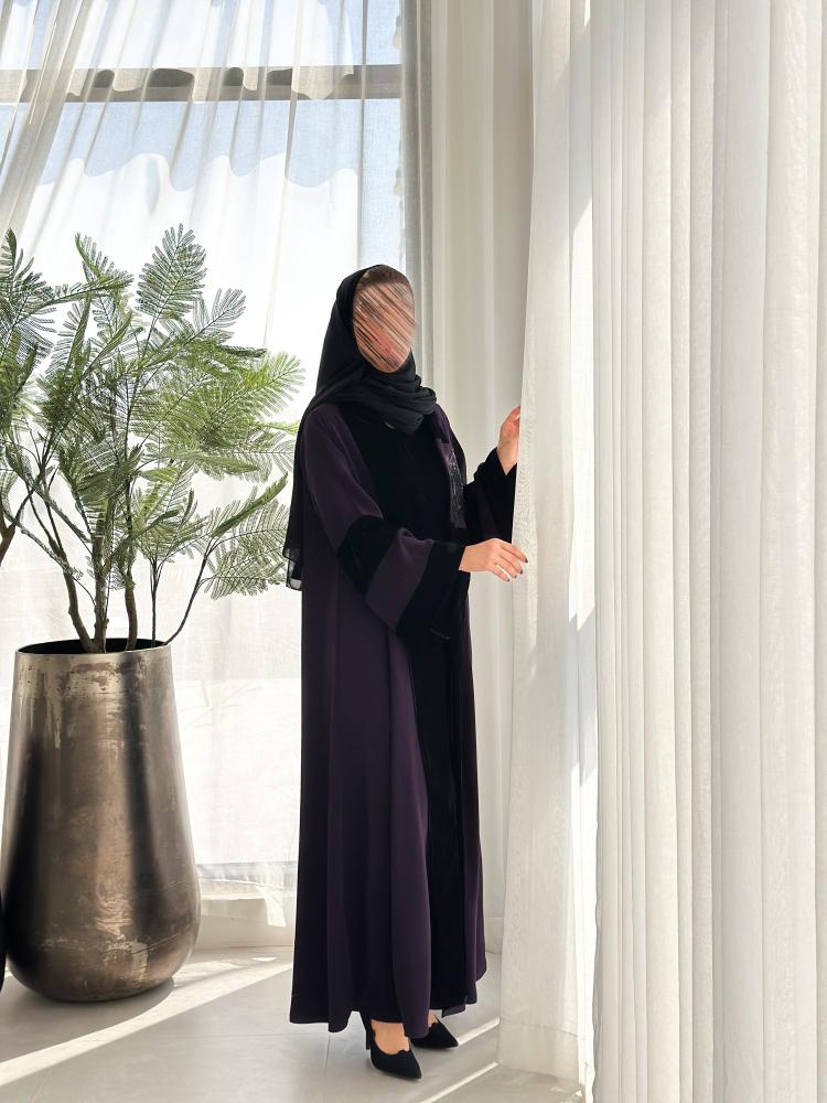 استمتعي بإطلالة فاخرة مع عبايات موف غامق مزينة بمخمل من الأطراف وتطريز أنيق تصميمها الكلوش يضمن لكِ الراحة والأناقة في كل مناسبة الان من AL MAHA.